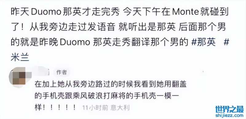 在网友的文案中现身,那英近两天的确在米兰参加时尚活动,行程刚好能对上,而且那英在街头发语音的声音很有辨识度,熟悉的歌迷一下就能辨认出来。最有意思是,据说那英当天用的手机壳跟前阵子上真人秀打麻将时的一模一样,这也令网友们的印象相当深刻,。
