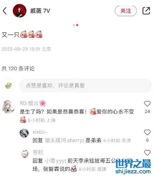 3、戚薇二胎生子演员戚薇昨天在平台po出好消息“又一只”,表示自己二胎已降生,三口之家现在晋升为四口之家了。