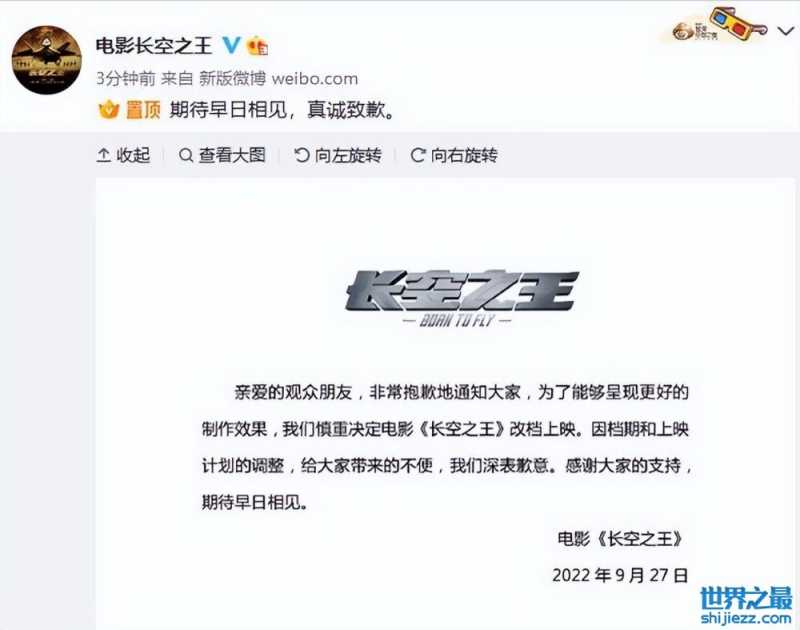 9月27日,《长空之王》的官方账号正式公布消息,宣布《长空之王》改档上映。