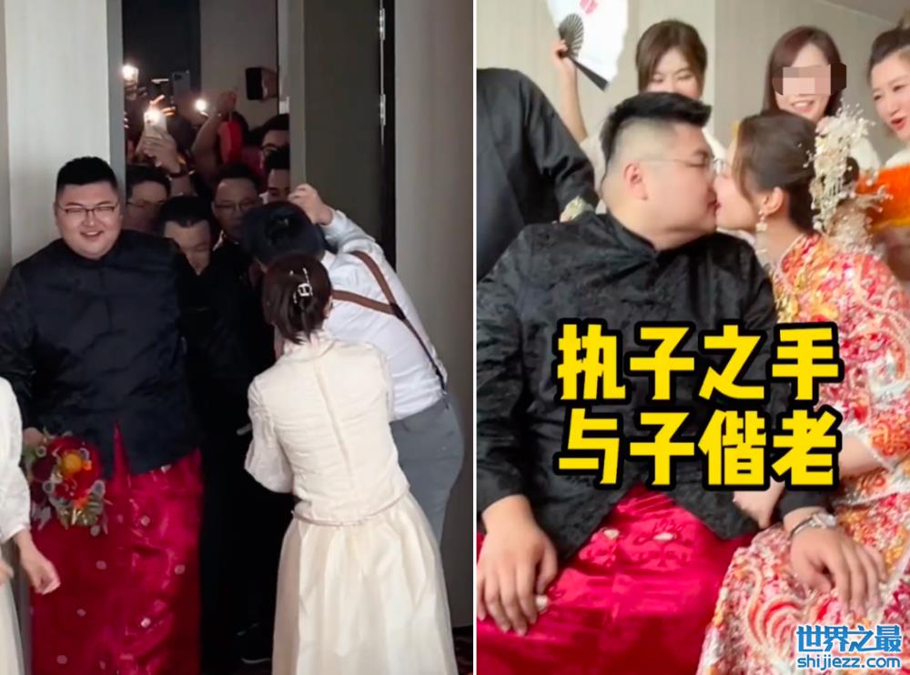 两人结婚地点在江苏,男方先带着4个伴郎和亲友团来到女方送亲酒店,经过一系列发红包、撞门、挑战任务等经典迎亲环节,最终猴哥接到了老婆何钰欣,两人在众人欢呼声中接吻秀恩爱。