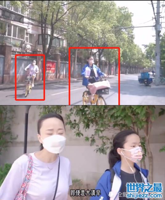 她和女儿骑共享单车前往拳馆,她打扮简单,穿T恤背着帆布袋,女儿则是黑T外面套着校服头戴耳机,小朋友看起来很酷。