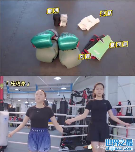 打拳之前准备工作一定要做得充分,什么拳套、脚踝套、绷带和护膝,将人武装得安全系数很高,王一楠和女儿也快速换好运动服,跟着教练进行热身。