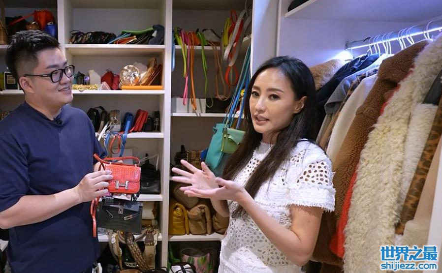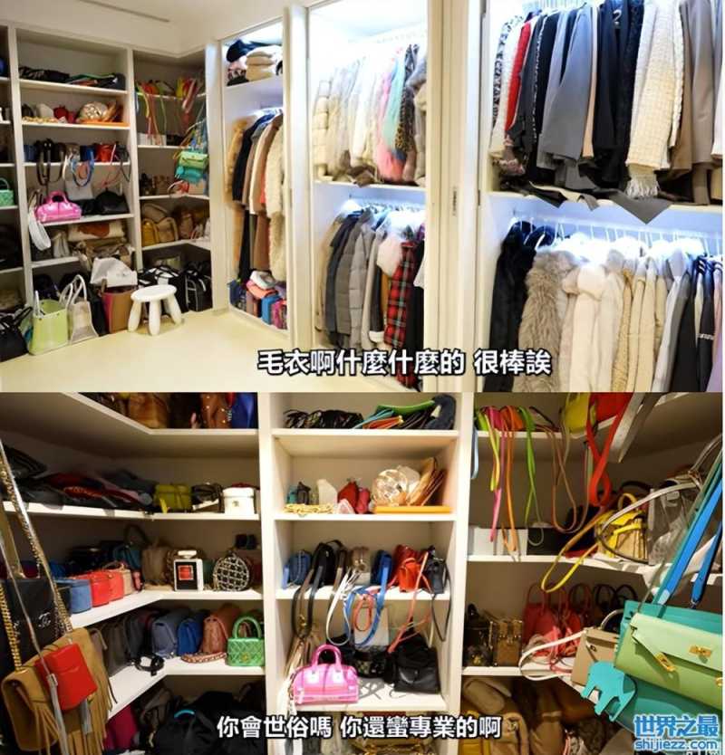 光是鞋子就足足摆满了两面墙壁,她的衣服和包包则是同样占据了超大化妆间的另外一个角落。尤其是角落里满满一墙的奢侈品包包格外吸引大家的注意力。