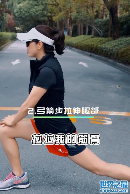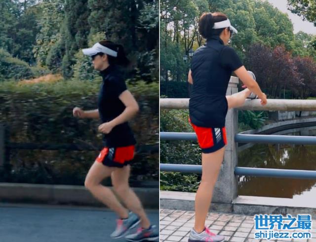 视频中,可以看到孙悦穿着一套十分标准的运动者打扮,吸汗短袖运动裤、跑鞋、遮阳帽和墨镜,还因为早晚温差上半身套了个轻型小马甲。孙悦强调运动前一定要进行拉伸筋骨,让全身适当放松。