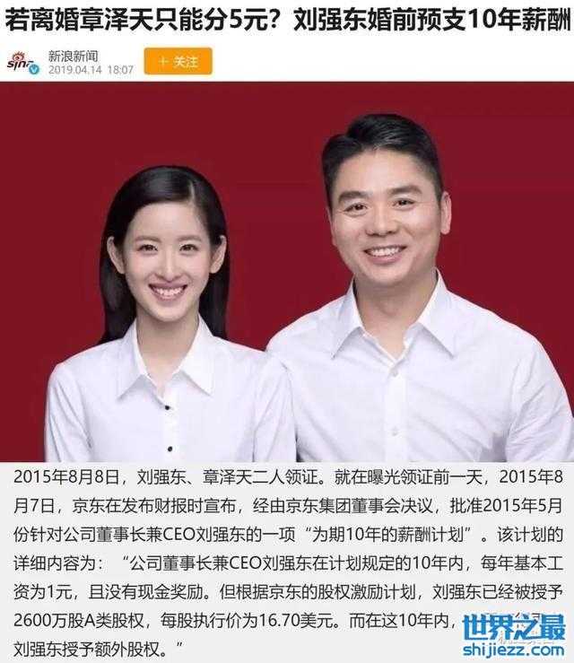 简单来说就是,刘强东婚前预支了自己未来10年的工资,总金额约为26.5亿,婚后10年每年只拿1元薪资。