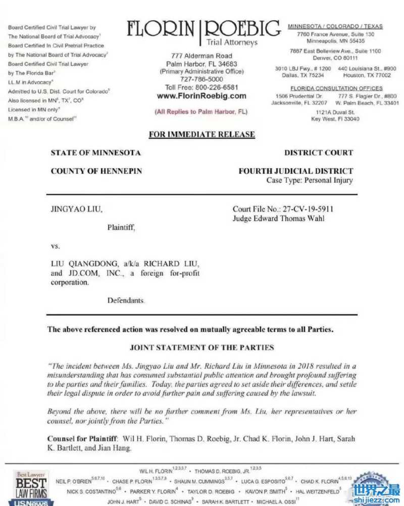 而据最新消息报道,原本定于10月3日开庭的刘强东明州案,已经提前迎来了大结局。双方律师团队发表联合声明称,双方已经达成和解。