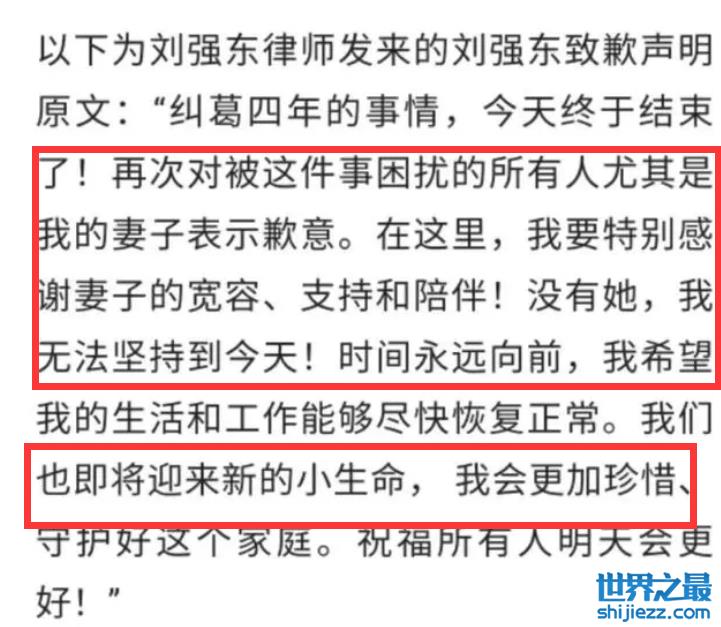 此后,刘强东就明州事件发表声明称,“纠葛四年的事件,今天终于结束了!再次对被这件事困扰的所有人尤其是我的妻子表示歉意。”同时,刘强东对章泽天表示了感谢,称没有她自己就无法坚持到今天。