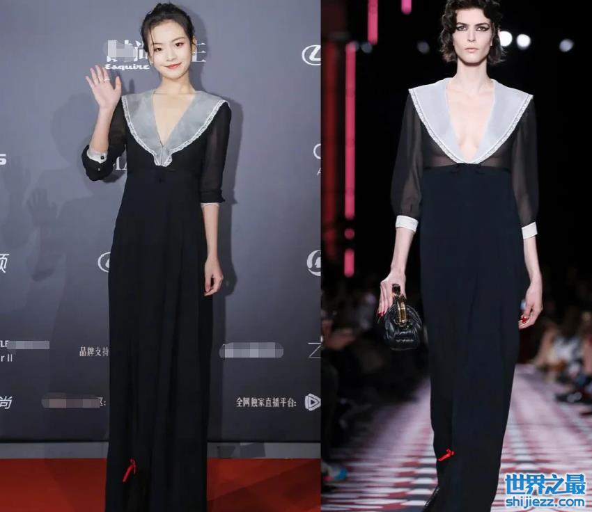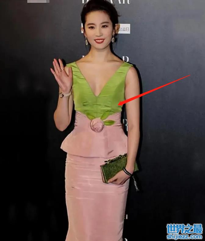 刘亦菲的礼服明明是一件深V,造型团队却将衣服缝了起来,因此显得不伦不类的。