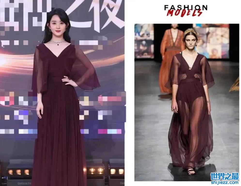 还有某次翻车造型,赵丽颖几乎被所有人吐槽老气,其实礼服就占了很大的原因。本身这件礼服颜色就比较深重,容易显老,设计师专门将衣服做得质感轻薄,内衬也很有设计感,可偏偏团队怕露大腿出来,改了。
