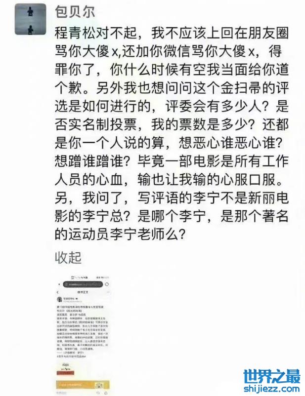 近日,有网友在社交平台上晒出了疑似包贝尔在朋友圈中怒斥程青松的截图,在图中,包贝尔言辞极其不文明,甚至还用上了“恶心”“傻X”等字眼,同时她希望能够和程青松本人见面,质问一下他,究竟是在什么评判标准之下,他才会被提名金扫帚奖。