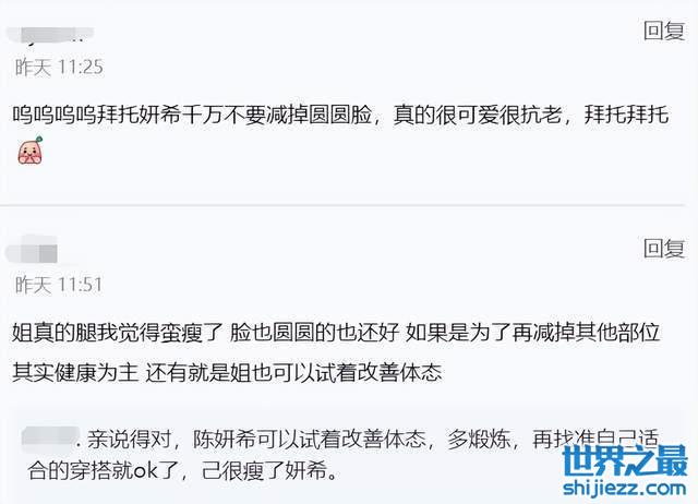 评论区的网友们也直接喊话陈妍希让她不要再减肥,毕竟她的圆圆脸真的很可爱很抗老,而从她的腿也能看出来整个人已经很瘦了。