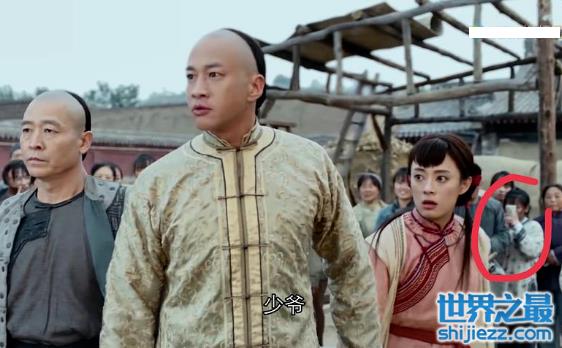 孙俪主演的《那年花开月正圆》的背景里,也出现这不合时宜的高科技。前景里的主演们正投入演戏呢,后面围观的吃瓜群众,不慌不忙拿出手机默默拍照。