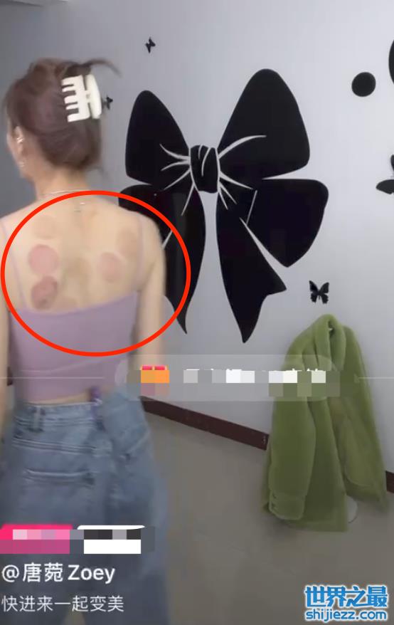 可以看到,唐菀背后密密麻麻有将近八九个拔火罐的印子,左边一侧颜色最深,中间相对比较浅,估计也是夏天湿气重工作太疲倦吧。虽然拔了火罐,但丝毫不影响唐菀的好身材,穿着吊带薄背细腰像纸片人,锁骨精致白皙。