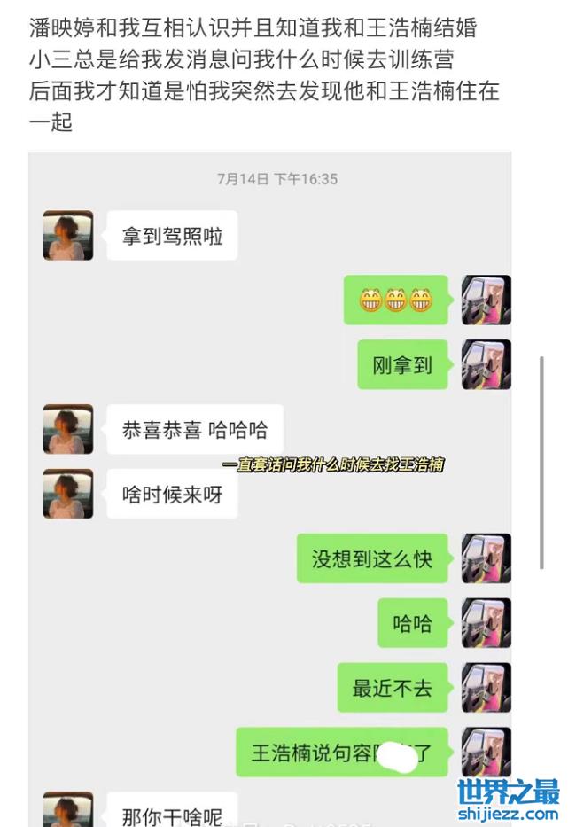 王浩楠妻子公开与潘映婷的聊天记录证实两人互相认识并且对方知道她和王浩楠结婚,聊天内容是问她什么时候来,很像是在套话,按照王浩楠妻子的理解是怕她突然去发现两人住在一起。