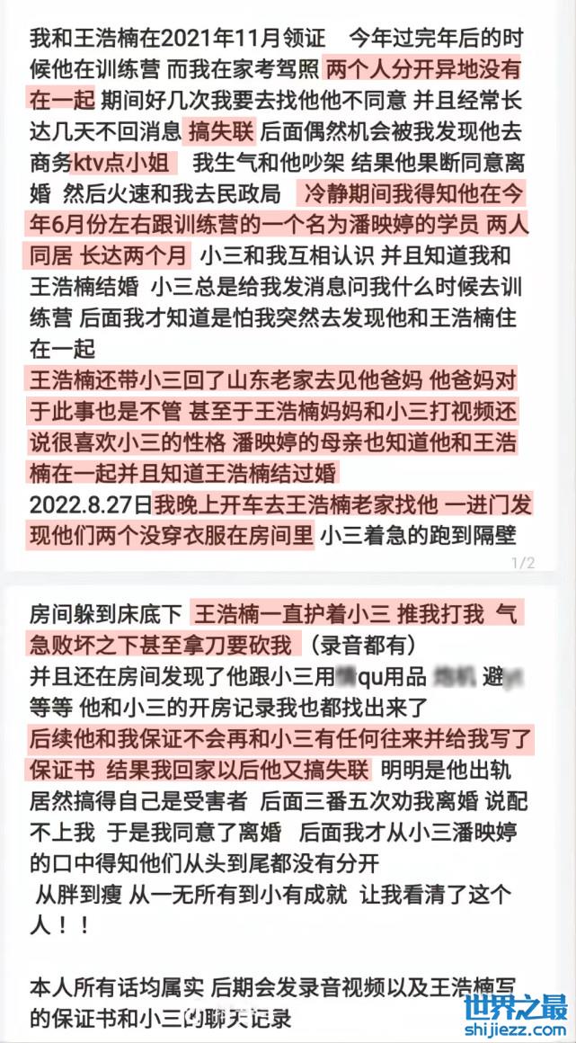 在离婚冷静期间,妻子又发现王浩楠和一名叫潘映婷的学员同居长达两个月,而她还认识潘映婷,对方总发消息问她什么时候去训练营,原来是怕被发现她和王浩楠住在一起。