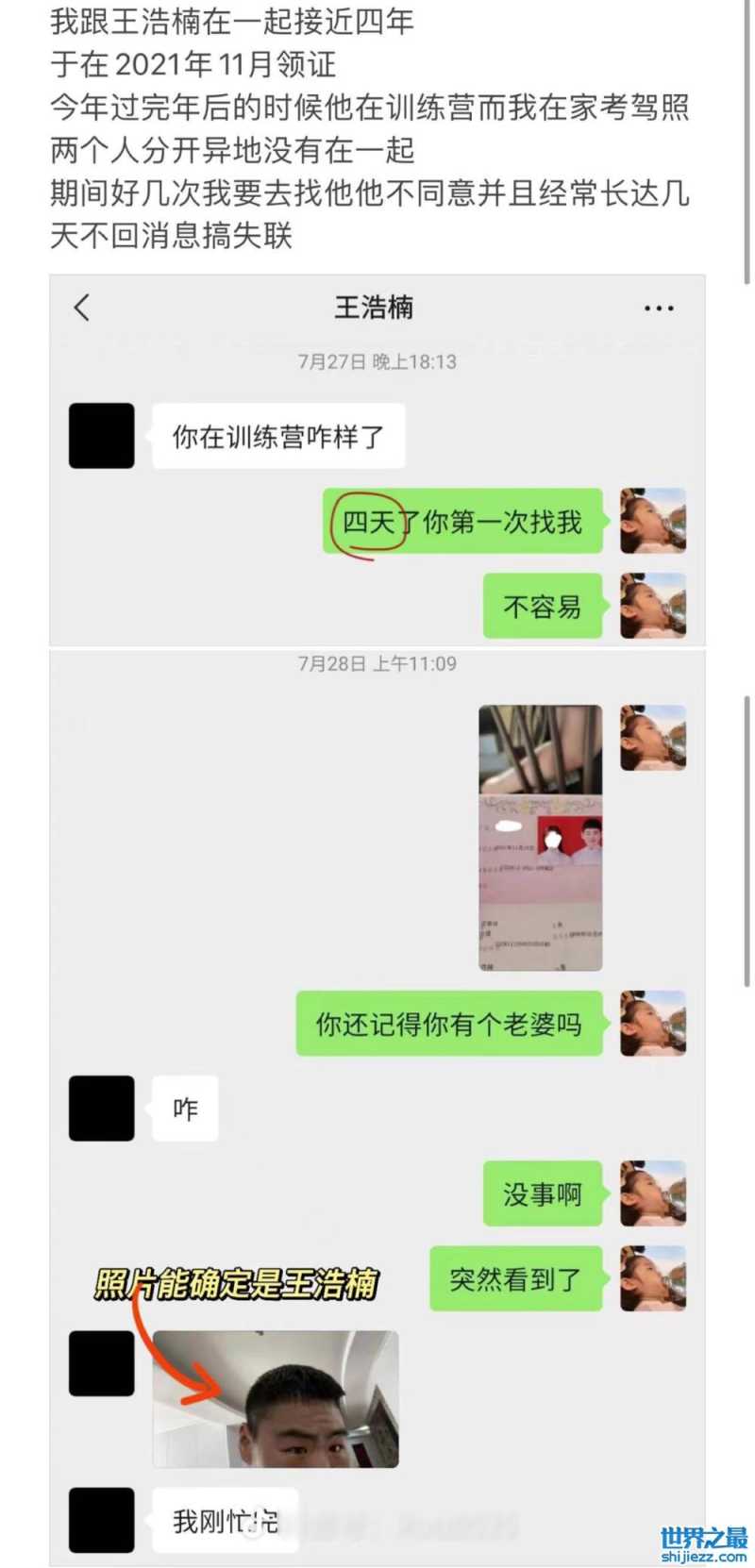第一张聊天记录的时间是7月27日,王浩楠联系妻子询问在训练营咋样了,妻子回他四天了才联系她一次不容易,后续询问他还记得自己有老婆不,对方晒出自己的照片直言刚忙完,可以确定就是发聊王浩楠本人。