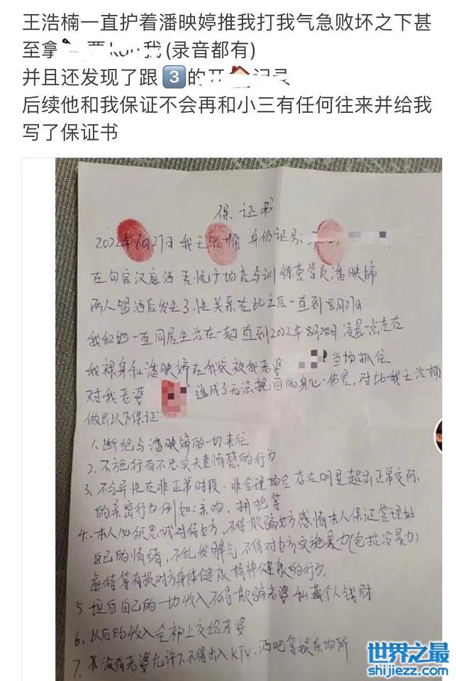 被发现出轨后,王浩楠则向妻子写保证书并且保证不会再和潘映婷来往,但没想到她回家后王浩楠又搞失联,后续还劝她离婚说自己配不上她,结果从头到尾都没和潘映婷分开,针对自己的爆料,王浩楠妻子还发了聊天记录以及潘映婷的视频。