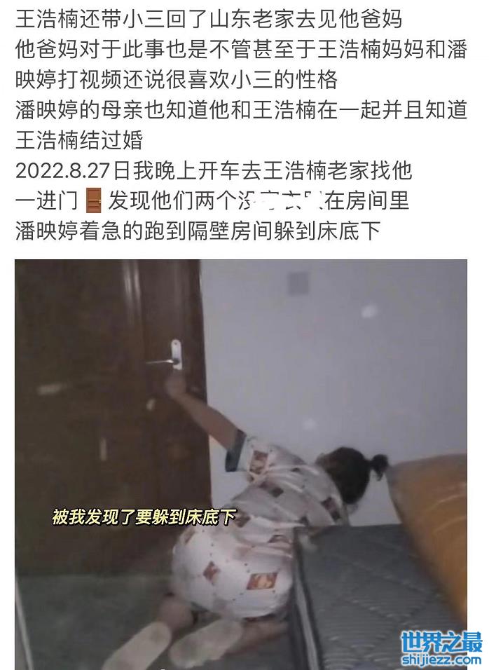 在2022年8月27日,王浩楠妻子回家找他,结果“当场捉奸”,潘映婷躲到床底下,王浩楠则一直护着她,并与自己的妻子有肢体冲突,气急败坏之下还扬言要砍她。
