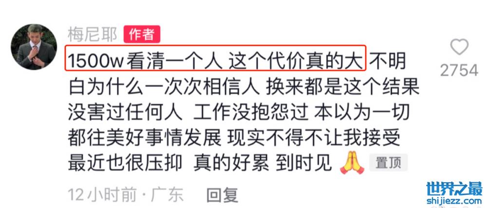 近日,在短视频平台粉丝超过三千万的网红梅尼耶,经过近十来天的断更后,在最新的视频中置顶了一条评论,透露自己疑似被公司创始人骗了1500万,并表示最近过得很压抑很疲惫,晚些和粉丝见面。