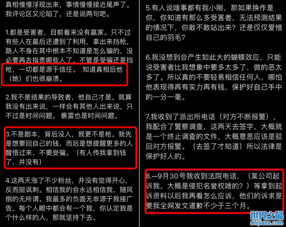 同时小刚学长透露自己被该公司告上法庭说侵犯了对方的名誉权,希望他发表道歉声明。但小刚学长想不通,他一直都是在控诉“神豪”个人的诈骗行为,没有说公司的过错,不清楚公司要他道歉的意义在哪里。