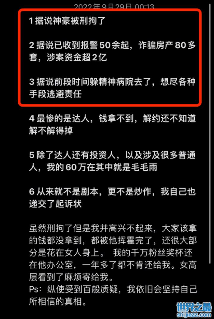 为什么会说梅尼耶疑似被公司老板骗钱呢?这事还要从9月29日,同为汽车达人的“小刚学长”在个人小号上发布了一条图文动态,表示据传“神豪”被刑拘了,还透露据说“神豪”诈骗房产八十多万,涉案资金超2亿元,已经有五十多个被骗的人报警。