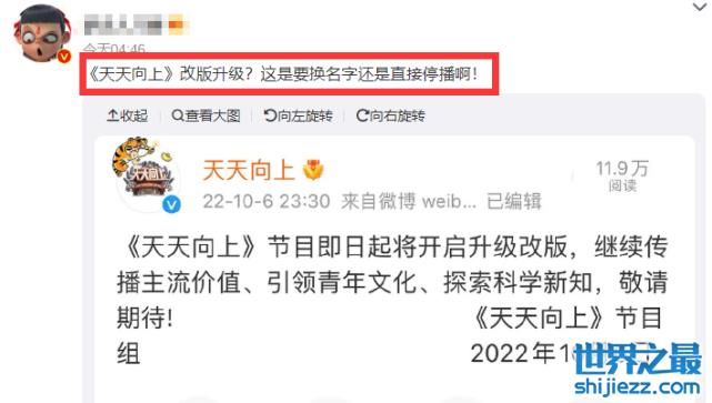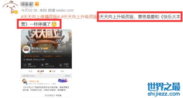 《天天向上》发文称节目即日起将开启升级改版,继续传播主流价值、引领青年文化、探索科学新知、敬请期待!
