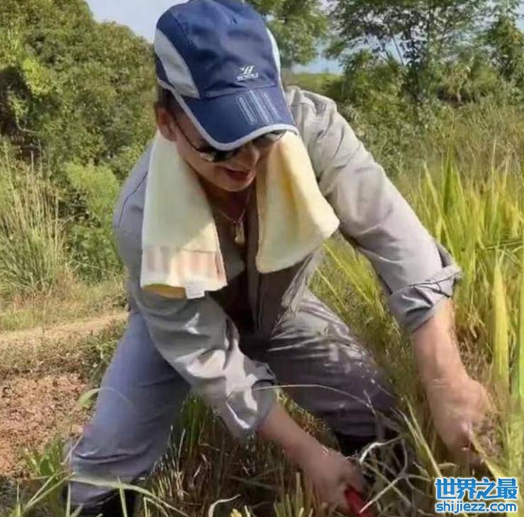 正值金秋丰收季,曹荣还和村民们一起去稻田收割水稻,他的动作略显笨拙、不熟练,看起来以前应该没有做过农活。一旁的村民们还打趣他,水稻不是用来大力砍的,是用割的。