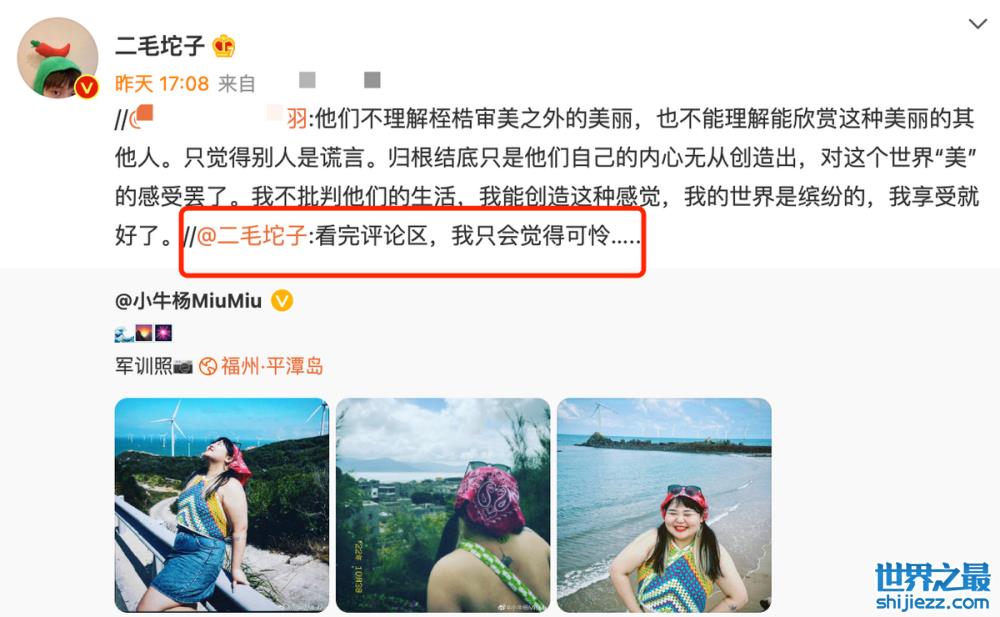 但与此同时,也有很多女性网友支持小牛杨自信做自己,让小牛杨屏蔽恶评好好玩耍,甚至自发帮小牛杨回怼恶评。小牛杨的好友百万大粉“二毛坨子”也转发了此动态,直言“看到评论区觉得喷子们好可怜。”