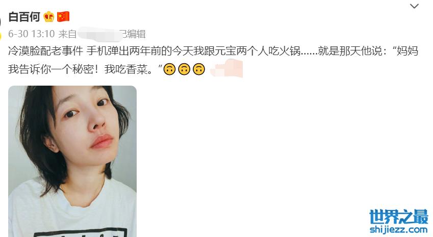 白百何和儿子的互动也十分搞笑,母子经常进行一些有趣对话,比如白百何儿子“元宝”吃火锅时就告诉不吃香菜的白百何自己喜欢吃香菜,而白百何则是一整个人遭遇晴天霹雳。