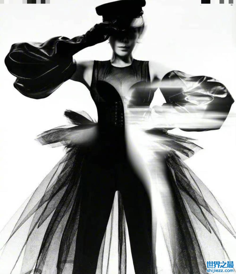 有一套和刘嘉玲的气场比较相贴,穿着低领黑色纱裙秀完美曲线,上围丰满双腿纤细,双臂戴着皮质手套飒爽干练,英气逼人。虽然看不清楚刘嘉玲的五官,但也能从照片中感觉到强大的气场,有种睥睨一切的霸气。
