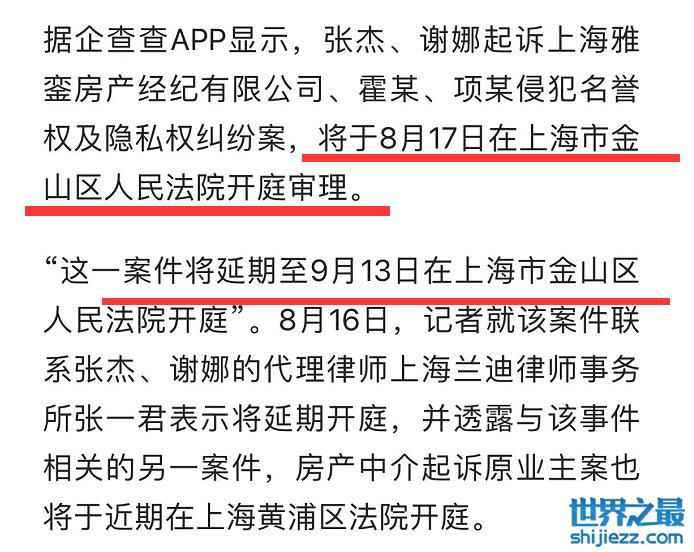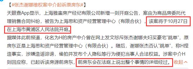 针对双方的纠纷,谢娜张杰也已经起诉中介公司,不过案件一直延期,原本是于8月17日开庭审理,后延期至9月13日,目前未查到双方已经开庭审理,想来中介起诉原业主案开庭审理后,所有的真相也都清楚了。