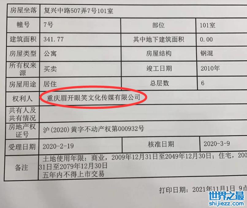事后查询这套房子的相关信息,可以看出这套房子目前在重庆眉开眼笑文化传媒公司名下,而这家成立于2019年10月的公司,谢娜拥有99%的实际控股权。