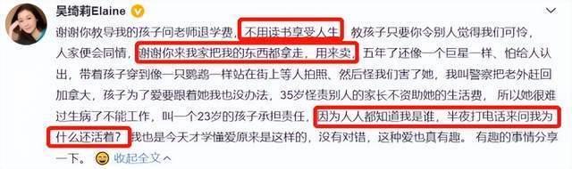 而在今年七月,吴绮莉就在社交平台发出长文控诉自己的“儿媳妇”,她表示自己这位“儿媳”让吴卓林退学,还拿走吴绮莉家里的东西变卖,甚至半夜打电话“问候”吴绮莉为什么还活着,可以说是让人深感震惊。