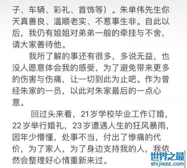所以,她也出面发文回应称,在家里产生矛盾的时候,朱家没有人替自己说话,从而使自己遭遇了前所未有的网络暴力。而且在现实生活中还遭遇到威胁,甚至被跟踪、绑架,被歹徒持刀相逼,在嘴里塞袜子,说的有鼻子有眼的。