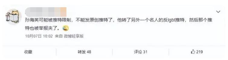 据悉他当时转发了一条了关于反对LGBT的内容,立马在外网上遭到了大量举报,推特上不少网友宣称必须举报孙海英和吕丽萍夫妻俩,不让两人成功移民国外。