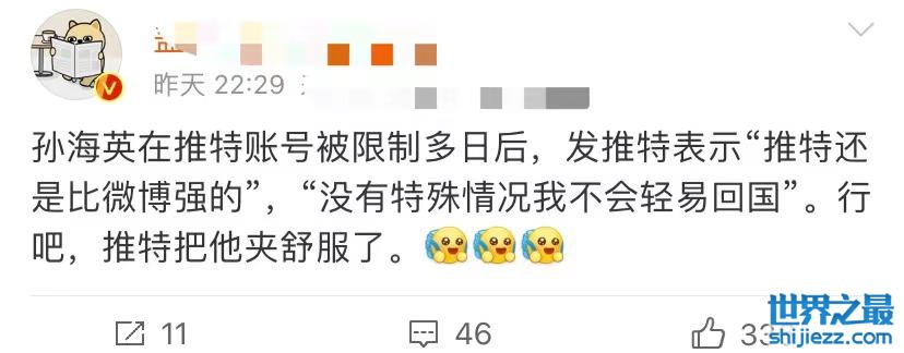 但网上很快就曝出新消息,称孙海英在推特账号被限制多日后,终于可以发推特了,还不忘拉踩一下国内社交平台,并且发声表示说“没有特殊情况我不会轻易回国”,看起来他依旧想继续自己的移民计划,留在国外生活。