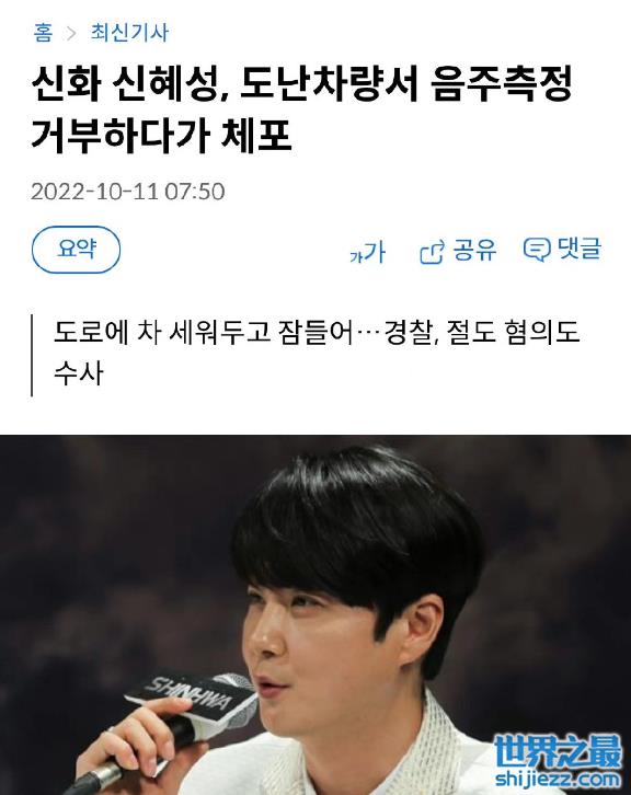 近日,韩国警方透露凌晨一点左右在马路中间停了一辆车,而韩国著名艺人申彗星就躺在车里睡觉。警方随即把他叫醒要对他进行酒精检测,谁知申彗星并不配合,因此被警方依法逮捕。