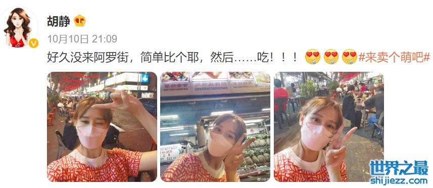 在照片中,胡静非常可爱地带着大家全方位地了解了一些东南亚的路边摊,从头顶上的大招牌再到路边上摆成好几排的大菠萝,看起来四处都充溢着人间烟火气。