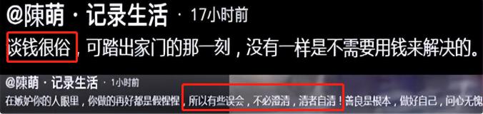 面对网友的质疑,陈萌表示“谈钱很俗,但踏出家门后,没有一样是不需要用钱解决的”,还表示“清者自清”,不会做出更多的解释。