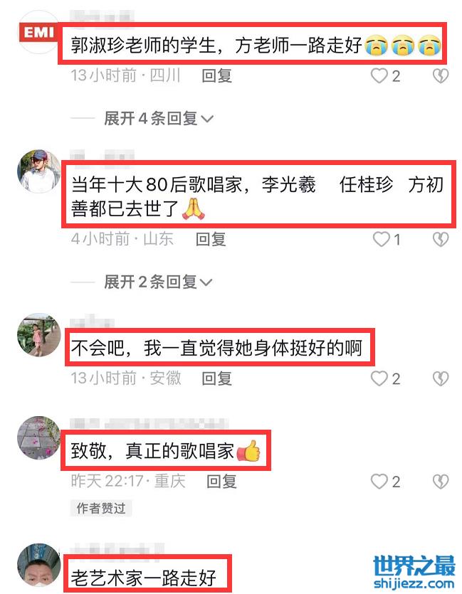 在得知方老师去世的消息后,不少网友更是特意留言表示悼念,可以看出,很多网友都对方初善老师的作品耳熟能详,她的歌声也是影响了一代又一代的人。