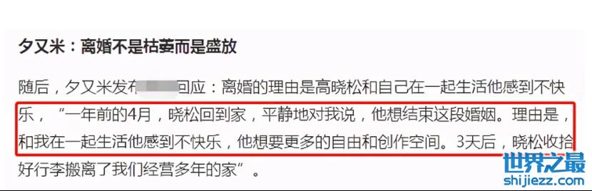直到2014年,高晓松发布离婚声明,已与设计师妻子夕又米于2013年6月就已签署离婚协议,称离婚后两人会共同抚养女儿。
