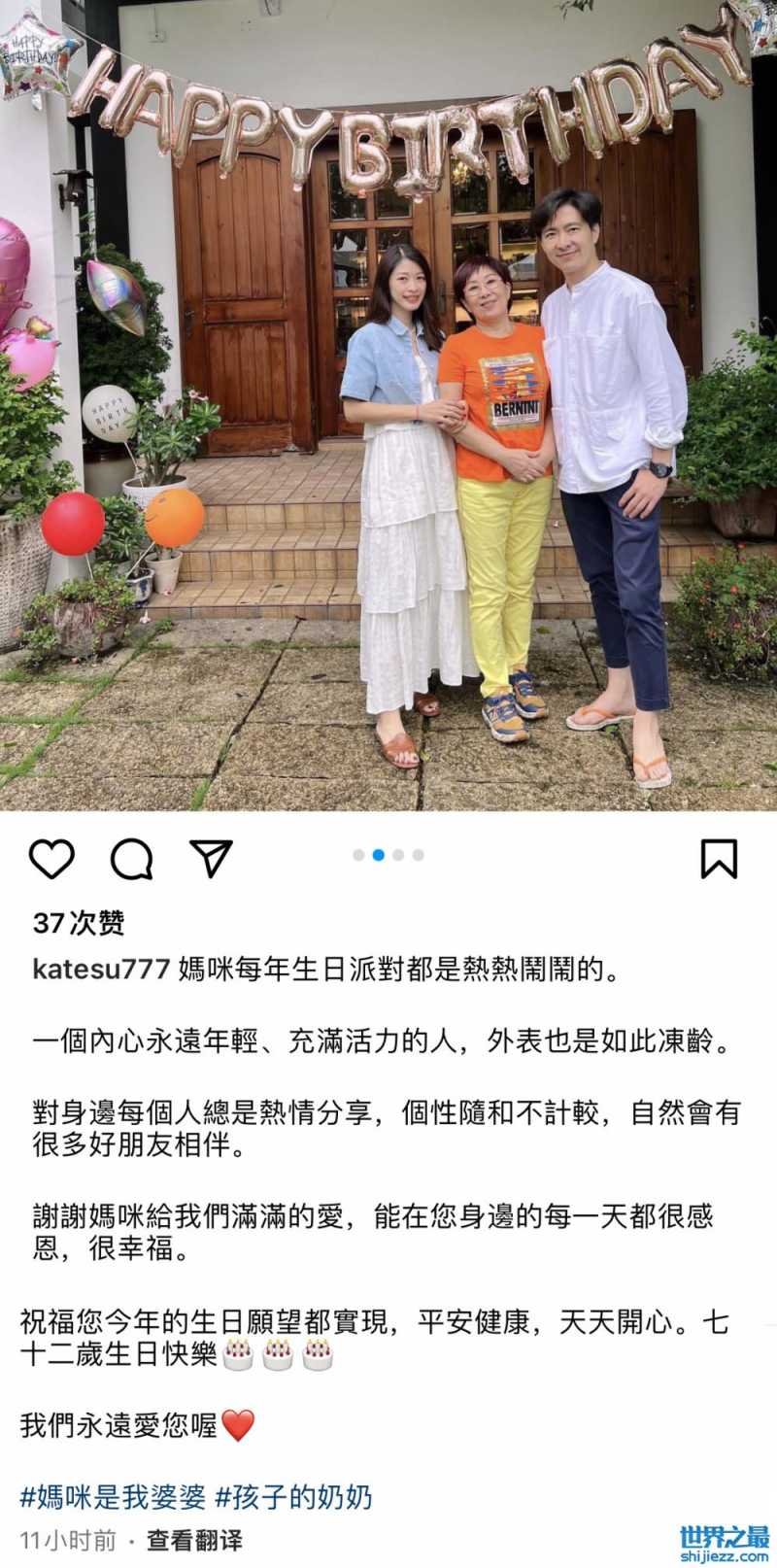 苏明慧与婆婆合影时,还挽着婆婆的胳膊,也为其送上了生日祝福,她说妈咪是一个内心永远年轻、充满活力的人,外表也是如此冻龄,对身边每个人总是热情分享,个性随和不计较,自然也会有很多好友相伴,也谢谢妈咪给予满满的爱,能在您身边的每一个都很感恩,很幸福,祝福您今年的生日愿望都能实现,平安健康,天天开心。