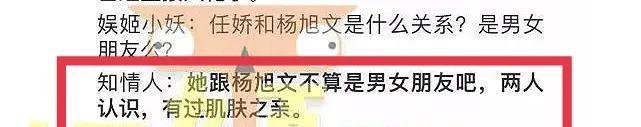 任娇好友透露,杨旭文和任娇的关系不算是男女朋友,但确实有过肌肤之亲,