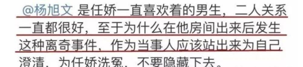 任娇好友更是直接站出来质问杨旭文,称他是任娇一直喜欢的男生,为什么在他房间出来后会发生这种离奇事件,要他给个说法,