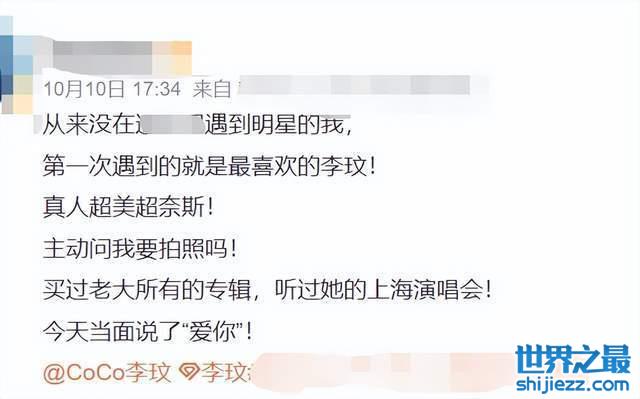 这位幸运的网友也发文表示,没想到自己第一次偶遇明星就是最喜欢的李玟,还说李玟本人超美超奈斯,主动询问网友是否要拍照,看来咱们女神也是十足的亲切呀。