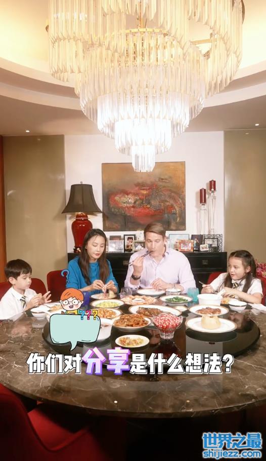 马雅舒当日穿着孔雀蓝的衣服,画着精致妆容端庄优雅,老公罗伯特穿一件衬衫干练有气场,同时有一份知识学者的气息。一家人正坐在一块一起吃饭,马雅舒默默帮助孩子们剥虾,老公则认真在解析“分享”这件事情的重要意义。