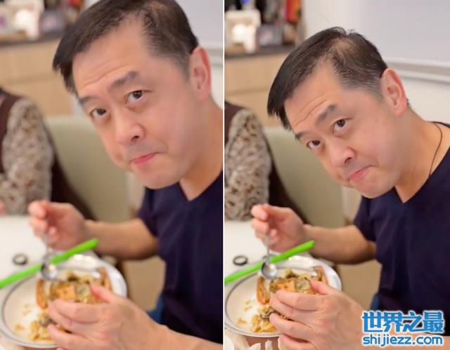 镜头接下来又解锁到了第二名人物,也就是陈凯琳的父亲。画面中的父亲看上去十分年轻帅气,精神气十足,仔细一看父女俩的眉眼特别像,也正在拿着勺子津津吃蟹黄。