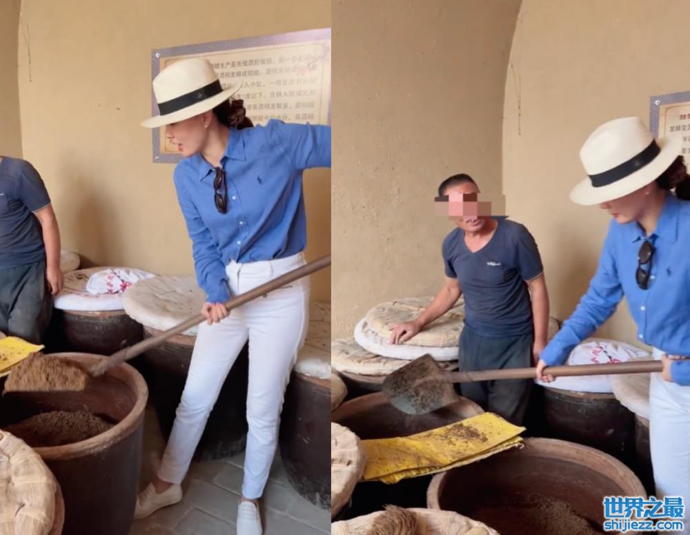 只见刘芳菲在一个制作醋的小房间,正在尝试制醋的某个环节,和一旁的专业师傅热聊着。只见刘芳菲双手紧握铁铲,挑起包含高粱、稻壳等物种的“原料”往另一个大缸子里搬运。挑了半天,刘芳菲直言醋工个是力气活,自嘲自己的速度实在是太慢了。