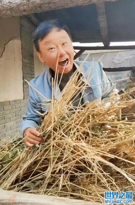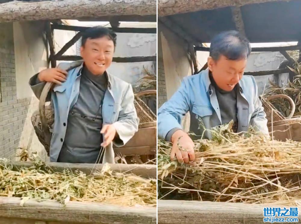 可以看到,邵峰身上全是干农活的灰尘,灰色内搭已经快要变成黑色了,蓝色外套也已经发灰。邵峰一边放声高歌一边放下竹篮子整理干草,姿势熟练动作利落完全没有一丝嫌弃的姿态。值得一提的是,邵峰低头时我们能看见明显的头秃,但不知是不是戴的假发。
