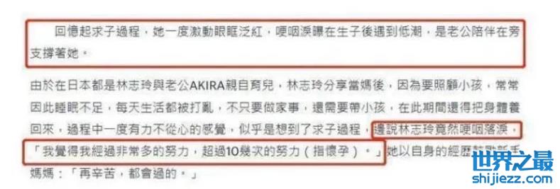 而林志玲说生产后有一段时间的低潮期,是老公一直在身边陪他,但也让不少人联想到早在刚结婚那会儿,AKIRA就在采访中暗暗透露过他觉得林志玲怀孕困难,还多次陪林志玲回台配合问诊和求子方法。